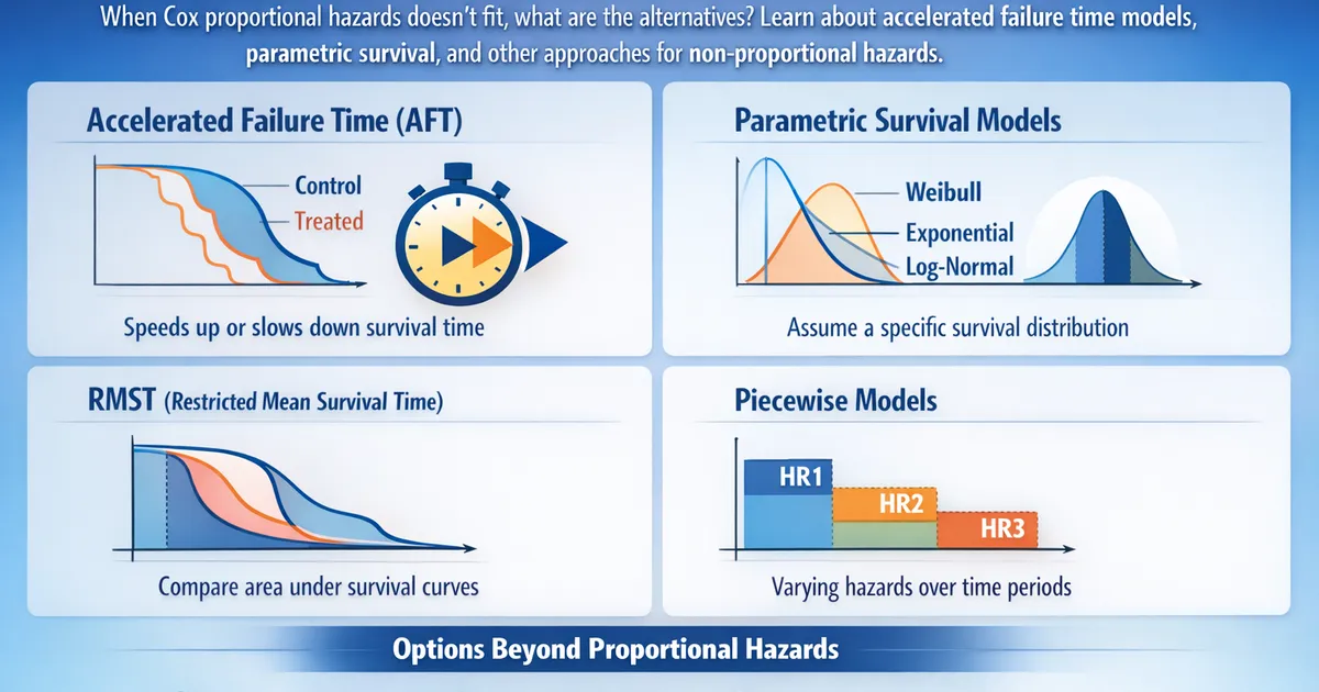 When Cox proportional hazards doesn't fit, what are the alternatives? Learn about accelerated failure time models, parametric survival, and other approaches for non-proportional hazards.