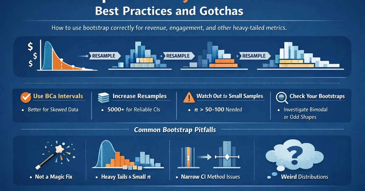 Bootstrap is the go-to method for inference on heavy-tailed metrics like revenue—it makes no distributional assumptions and handles skew naturally. But bootstrap has limitations: it requires your sample to represent the population, struggles with small samples and extreme tails, and needs careful implementation (BCa intervals, enough resamples). This guide covers best practices for bootstrapping heavy-tailed product metrics.