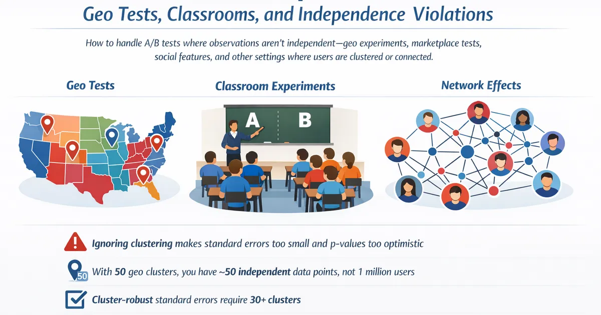 Standard A/B testing assumes independent observations: User A's outcome doesn't affect User B's. This assumption fails in geo experiments, marketplace tests, social features, and many other settings. When observations are clustered or connected, your effective sample size is much smaller than your user count, and ignoring this leads to false positives. Use cluster-robust methods to get valid inference.
