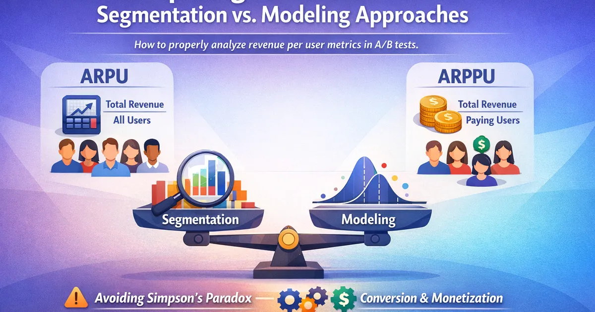 How to properly analyze revenue per user metrics in A/B tests. Learn the statistical pitfalls of ARPU vs. ARPPU, when to segment, and how to avoid Simpson's paradox.