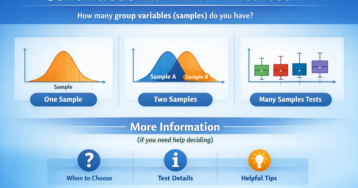 How many group variables (samples) do you have? One Sample - OR - Two Samples - OR - Many Samples Tests More Information (if you need help deciding) One Sample: If you only have...