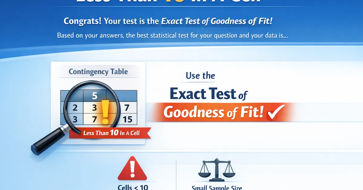 Congrats! Your test is the Exact Test of Goodness of Fit! Based on your answers to the StatsTest workflow questions, the best statistical test for your question and your data is...