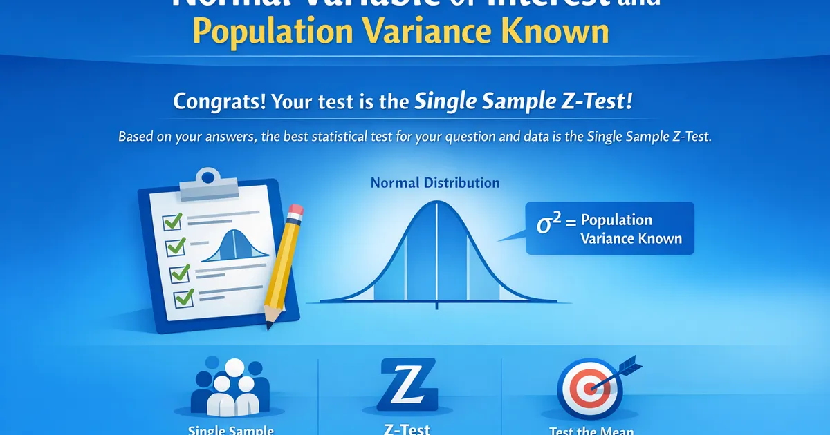 Congrats! Your test is the Single Sample Z-Test! Based on your answers to the StatsTest workflow questions, the best statistical test for your question and your data is the Sing...