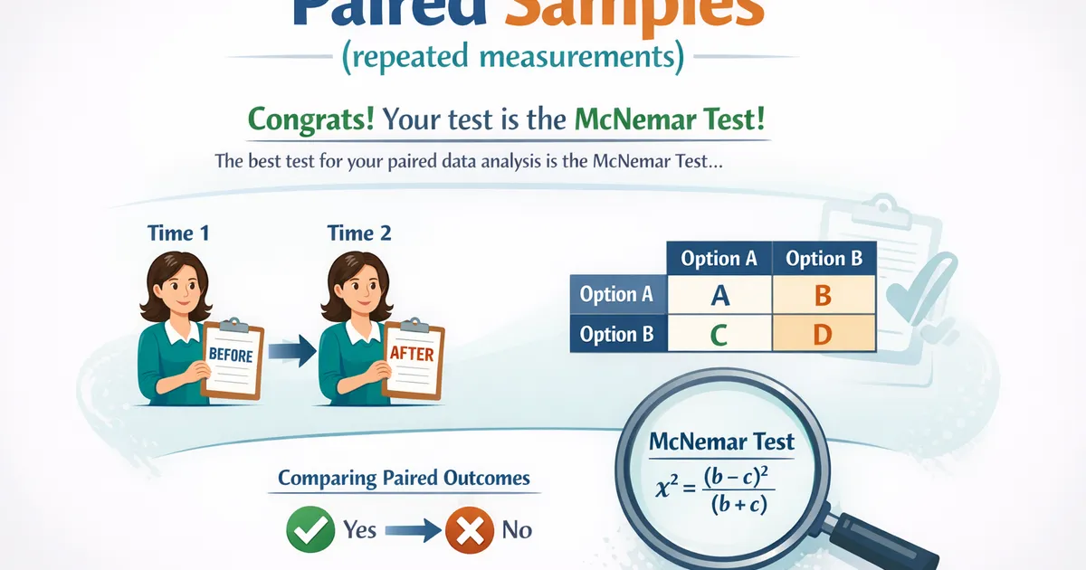 Congrats! Your test is the McNemar Test! Based on your answers to the StatsTest workflow questions, the best statistical test for your question and your data is the McNemar Test...