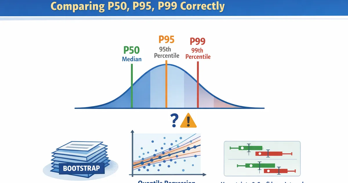 How to properly compare percentile metrics like latency P50, P95, and P99 across groups. Learn about bootstrap inference, quantile regression, and the pitfalls of naive percentile comparisons.