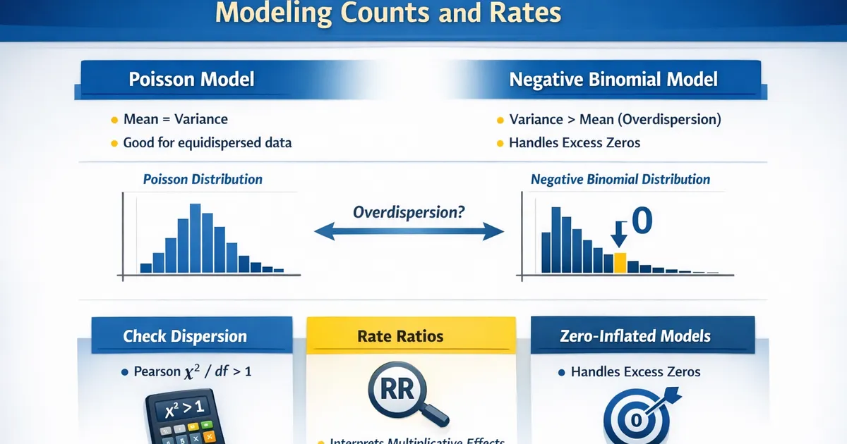 A practical guide to choosing between Poisson and negative binomial regression for count data. Learn to detect overdispersion, handle excess zeros, and interpret rate ratios correctly.