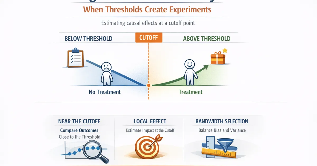 How regression discontinuity designs exploit score cutoffs to estimate causal effects. A practical guide for product analysts with real-world examples.