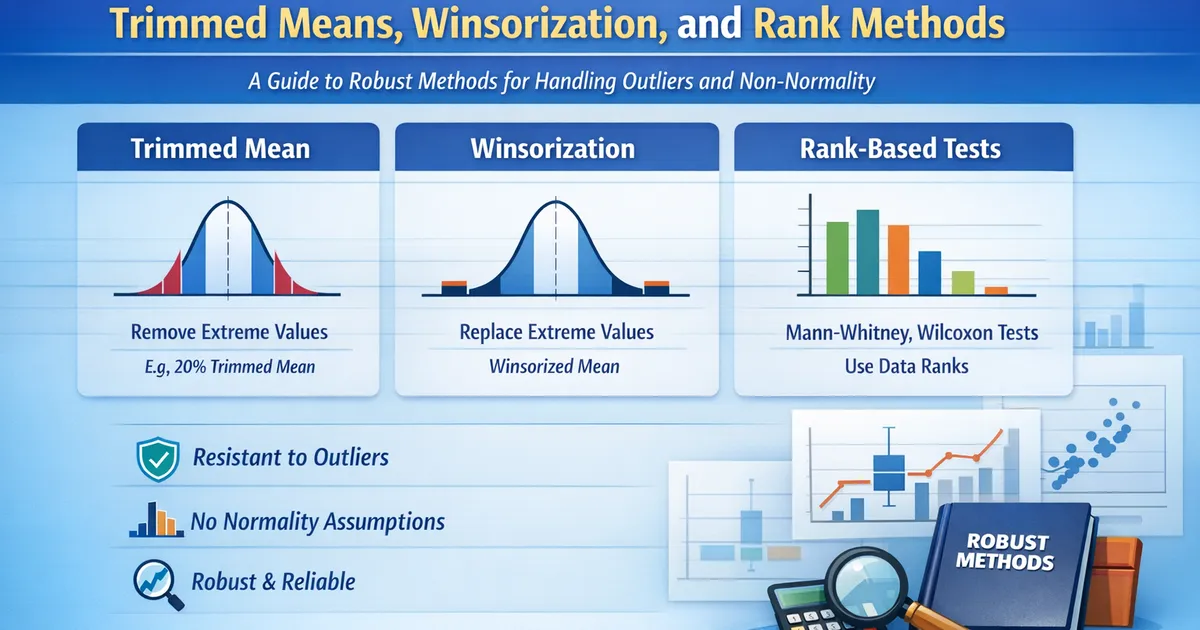 A practical guide to robust statistical methods that work without normality assumptions. Learn when to use trimmed means, Winsorization, M-estimators, and rank-based tests.