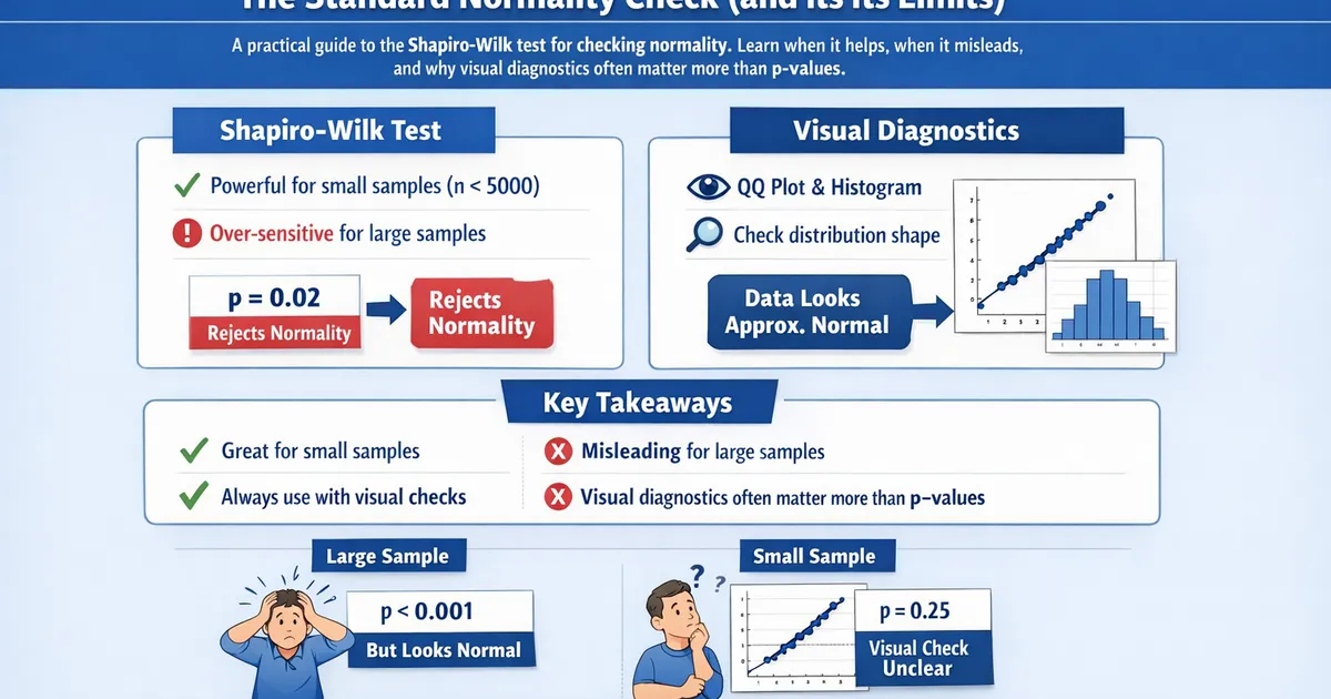 A practical guide to the Shapiro-Wilk test for checking normality. Learn when it helps, when it misleads, and why visual diagnostics often matter more than p-values.