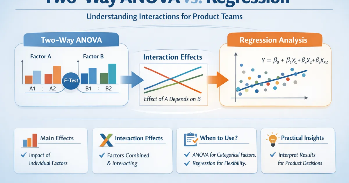 When to use two-way ANOVA versus regression for analyzing experiments with multiple factors. Covers interactions, main effects, and practical interpretation for product analytics.