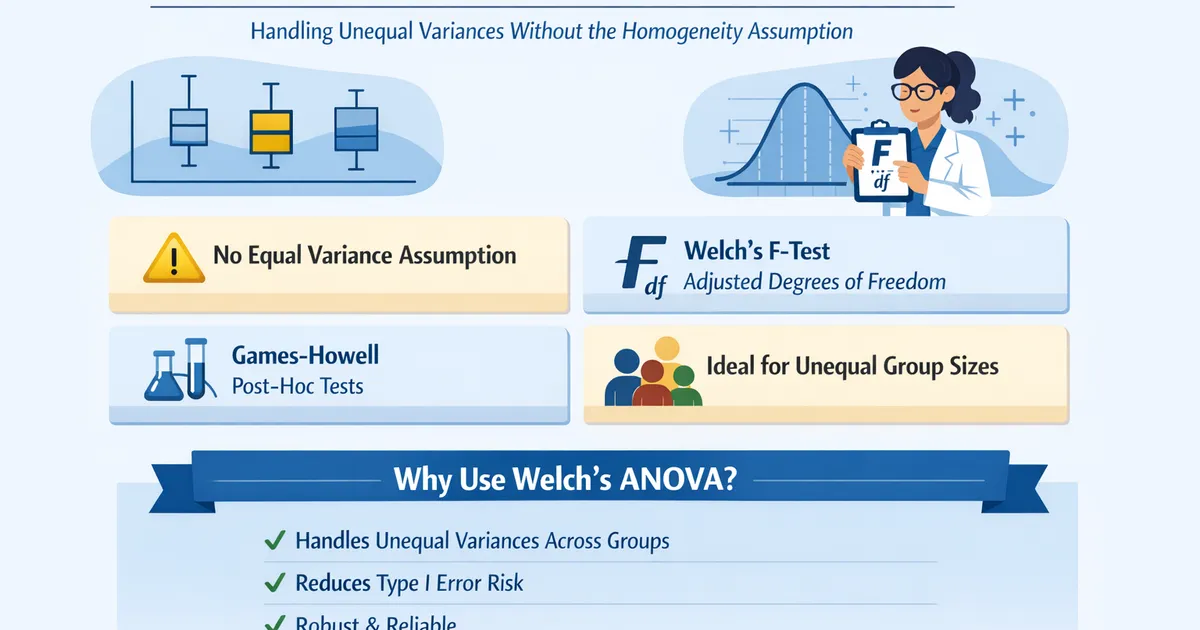 Welch's ANOVA handles unequal variances across groups without requiring the homogeneity assumption. Learn when to use it instead of standard one-way ANOVA and how to follow up.